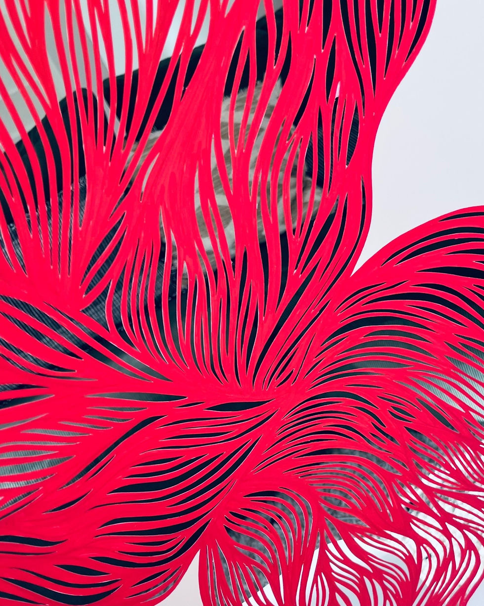 Tissages où chaque élément porte une histoire. Des oeuvres peintes, découpées puis tissées à la main pour se reconstruire en une pièce unique. Ces pièces mêlent motifs géométriques et accidents heureux. Presqu'en mouvement, lorsqu'elle est libérée, plus statutaire lorsqu'elle est encadrée.